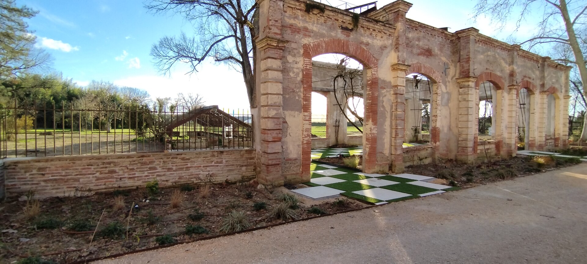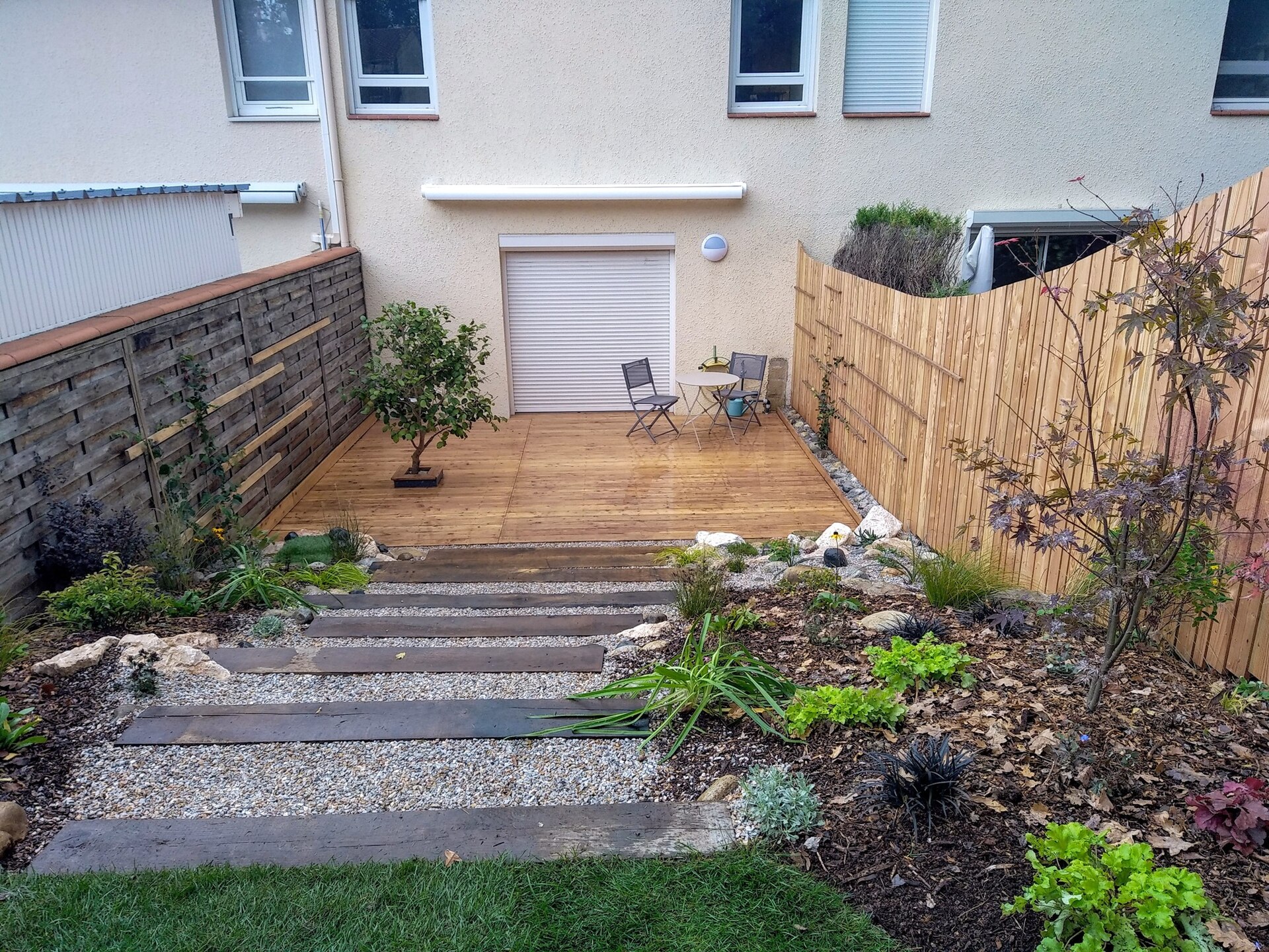 Cette terrasse est en composite avec une réservation pour laisser le figuier faire de l'ombre et offrir ses délicieux fruits.